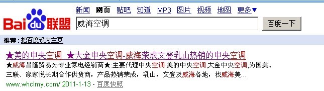 同样的,威海中央空调,威海美的中央空调,威海大金中央空调,荣成,乳山,文登等威海各地的空调,中央空调,美的中央空调,大金中央空调都有了好的排名.基本上都到了第一页.